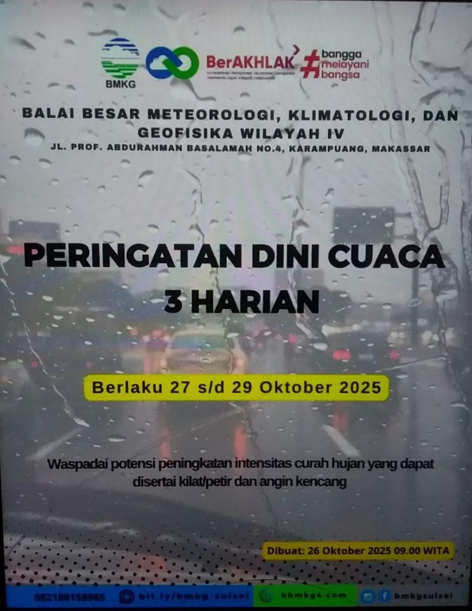 Prakiraan cuaca untuk Sulawesi Selatan pada tanggal 27 Oktober 2025 menunjukkan kondisi yang bervariasi, di mana pada pagi hari umumnya berawan dengan potensi hujan ringan di Luwu Utara, Barru, Pangkep, Maros, Makassar, Gowa, Takalar, Jeneponto, Bantaeng, Sinjai, dan Bone, kemudian pada siang dan sore hari, potensi hujan ringan hingga sedang diperkirakan melanda hampir seluruh wilayah Sulawesi Selatan,