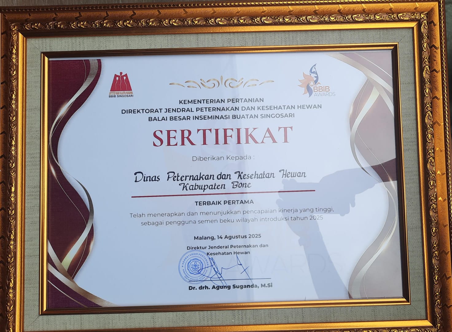 BONE,TRENDSULSEL–Dinas Peternakan dan Kesehatan Hewan Kabupaten Bone kembali mencetak prestasi membanggakan di tingkat nasional. Pada ajang BBIB Award 2025, instansi ini berhasil meraih peringkat pertama dalam kategori pemanfaatan semen beku di wilayah introduksi. Penghargaan tersebut diberikan oleh Direktorat Jenderal Peternakan dan Kesehatan Hewan, Balai Besar Inseminasi Buatan (BBIB) Singosari, Kementerian Pertanian RI.