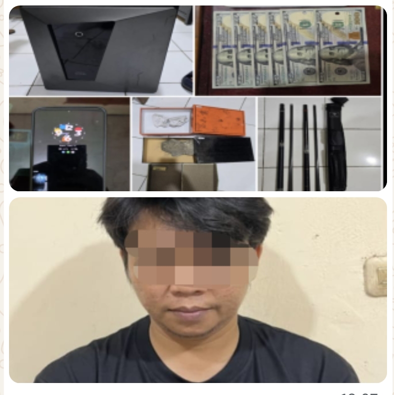 Pelaku ditangkap bersama sejumlah barang bukti, di antaranya satu buah brankas, satu buku rekening BCA, satu unit handphone, dua buah stik biliar, tiga buah kotak, dan enam lembar uang dolar Amerika pecahan 100 dolar.