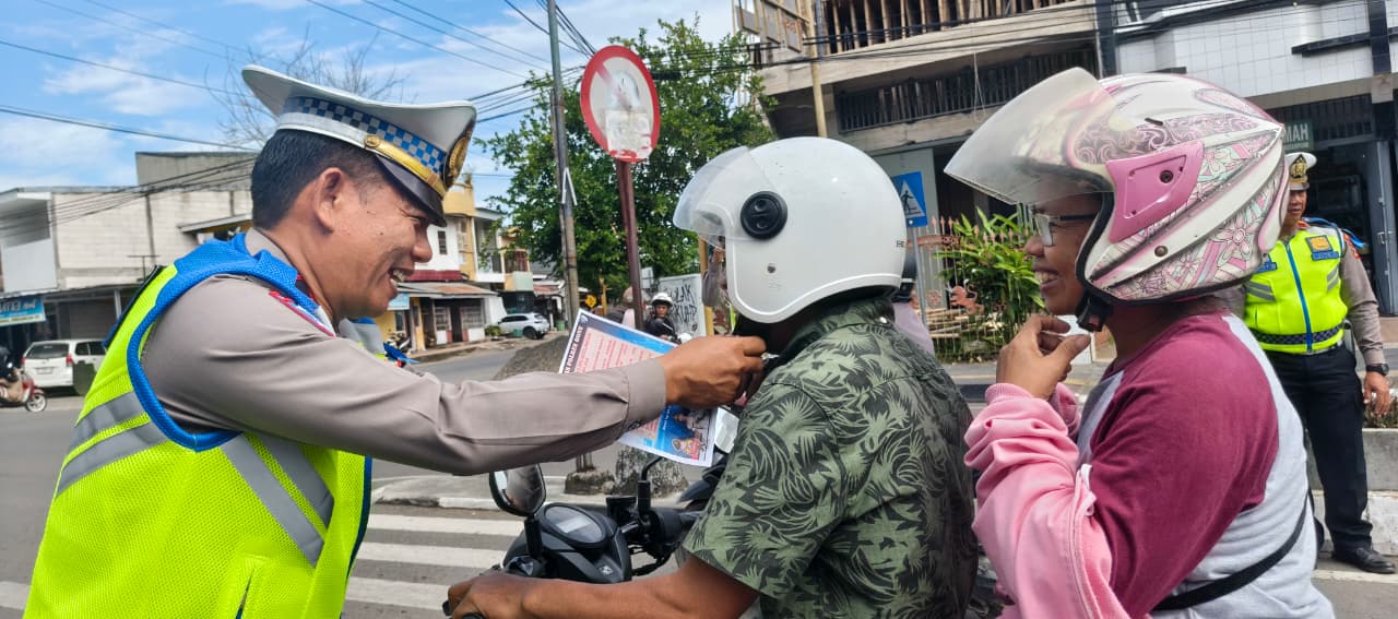 Dan membagikan brosur dan sticker tentang pelaksanaan Operasi Keselamatan Pallawa 2026, mengimbau kepada pengendara Roda 2 agar selalu menggunakan Helm SNI dan mengklik Helm.