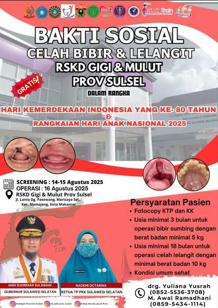 Direktur RSKD Gigi dan Mulut Sulsel, drg. Wiwik Elnangti Wijaya, Sp.KGA, mengatakan bahwa program ini merupakan bentuk kepedulian rumah sakit terhadap kesehatan anak-anak, khususnya yang memiliki kelainan bawaan pada bibir dan langit-langit mulut.